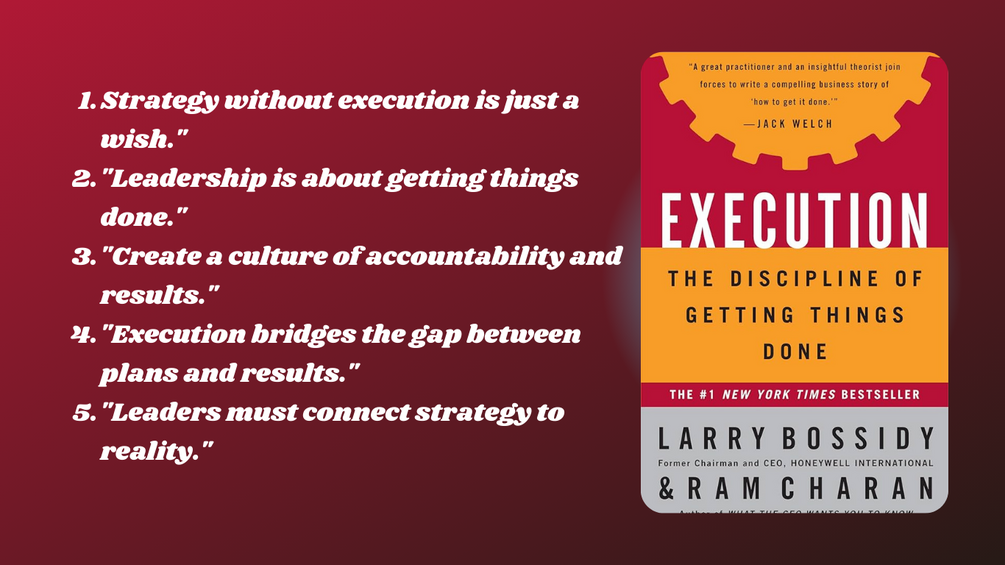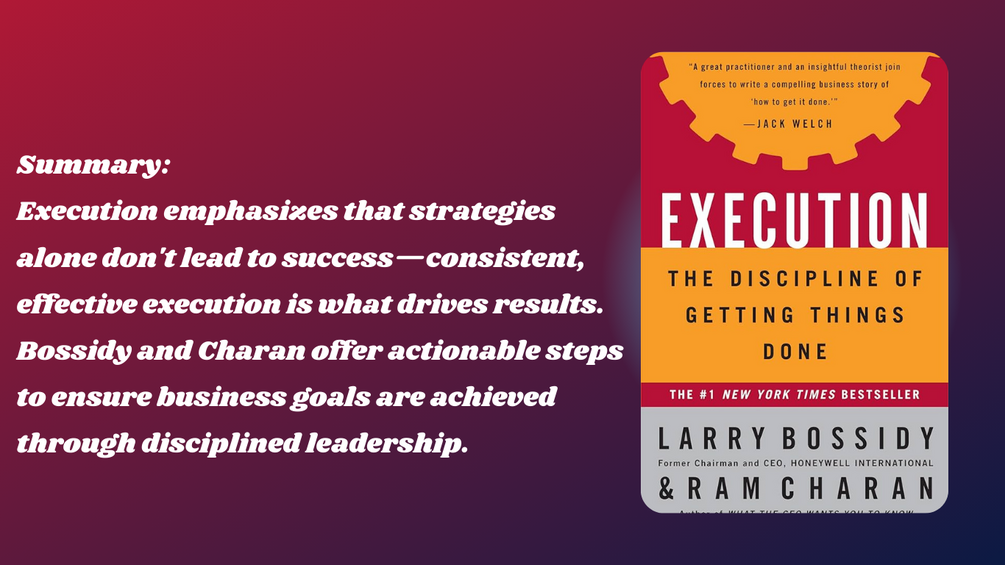 The book delves into the often-overlooked discipline of execution—how to close the gap between what leaders want to achieve and the results they deliver. Filled with practical advice, real-life examples, and actionable steps, Execution serves as a comprehensive guide for leaders at every level who want to achieve measurable success by turning strategies into reality.