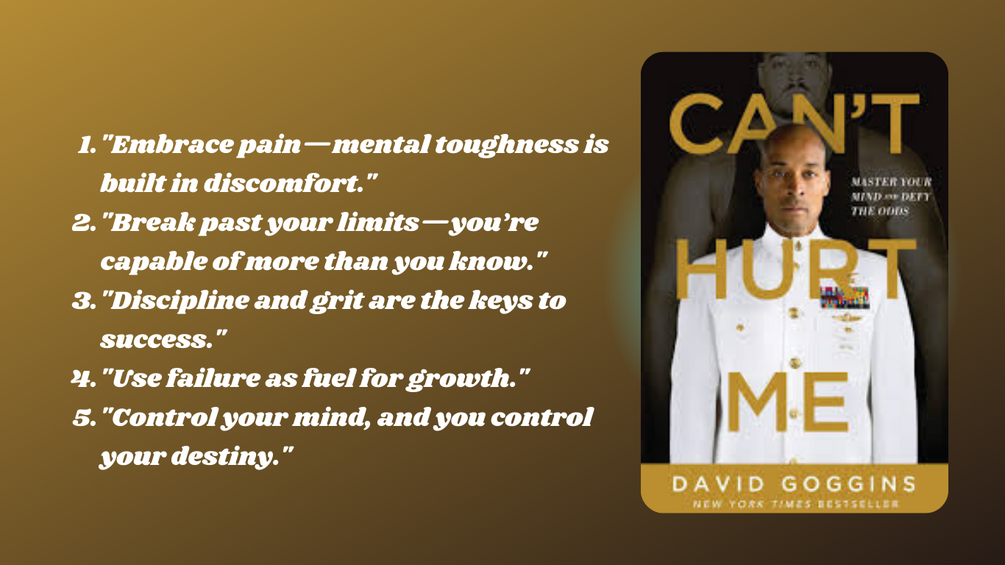 "Can't Hurt Me" is a memoir by David Goggins, a former US Navy SEAL and endurance athlete. The book takes readers on a journey through Goggins' childhood, his struggles with racism and poverty, and his transformation into one of the toughest men on the planet. With unflinching honesty, Goggins shares his experiences and the lessons he learned along the way, from the importance of mental toughness to the power of self-discipline.